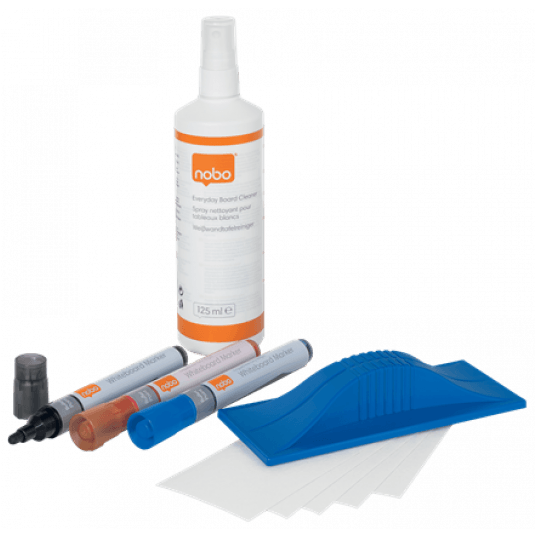 Kompletny zestaw startowy do tablic suchościeralnych zawiera wszystkie akcesoria, które są Ci potrzebne do korzystania z tablic suchościeralnych Nobo. Zawiera 3 markery, środek czyszczący w spray'u o pojemności 125 ml oraz gąbkę niemagnetyczną ECO.
